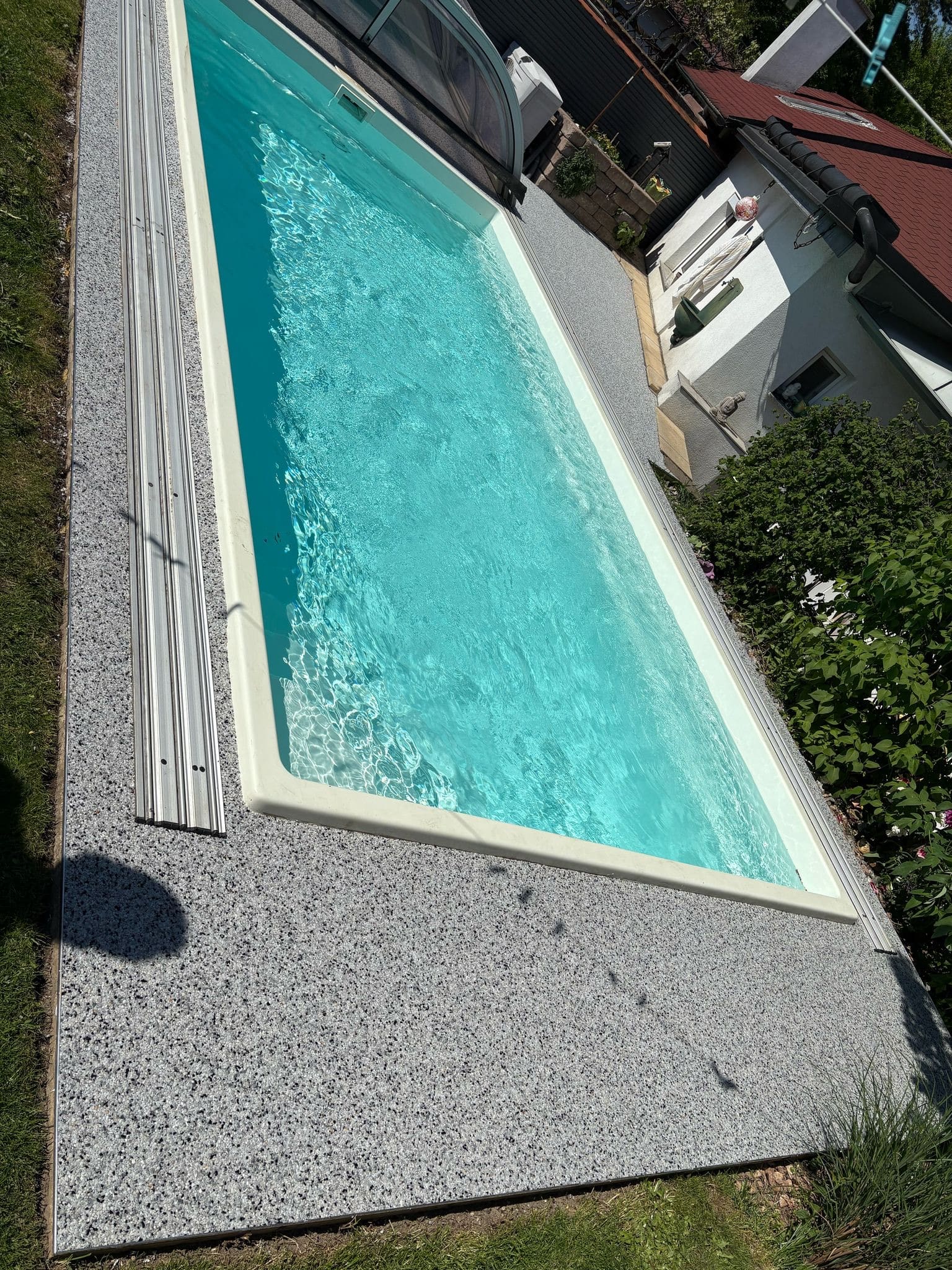 Untergrundvorbereitung, Grundierung und Verlegung – inklusive sauberer Randabschlüsse, Übergänge und Anschlussdetails rund um den Pool.